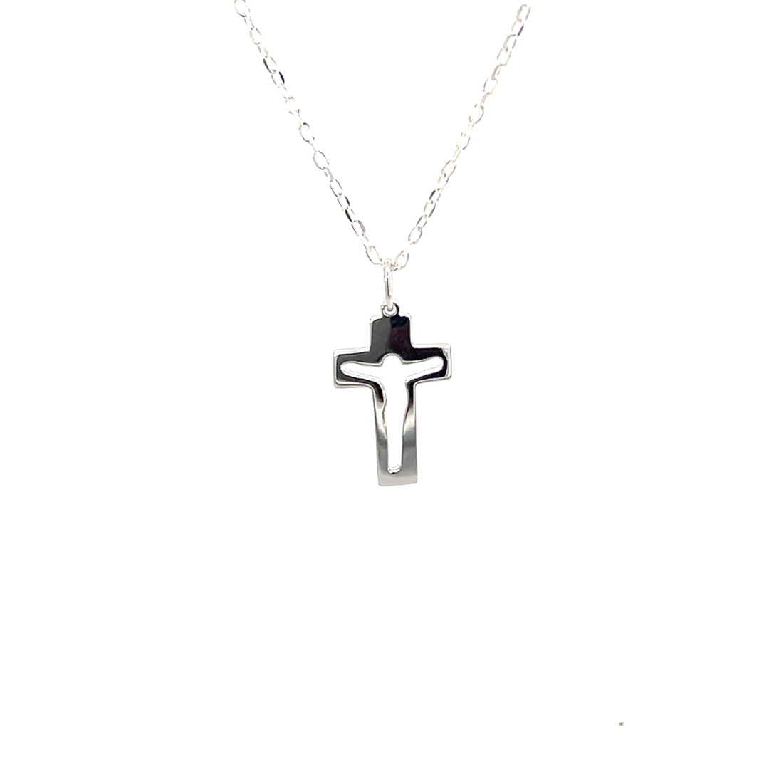El diseño presenta la silueta de Jesús en el centro de la cruz, creando un efecto minimalista y moderno que aporta un toque distintivo. Su cadena fina añade delicadeza, convirtiéndola en un accesorio ideal tanto para uso diario como para ocasiones especiales.