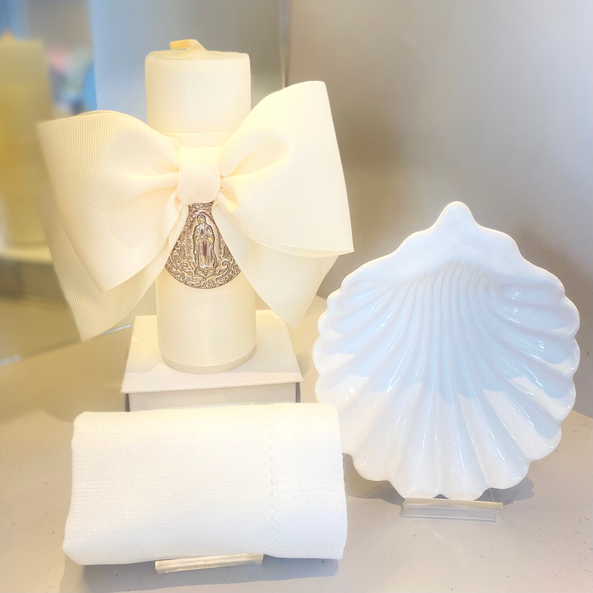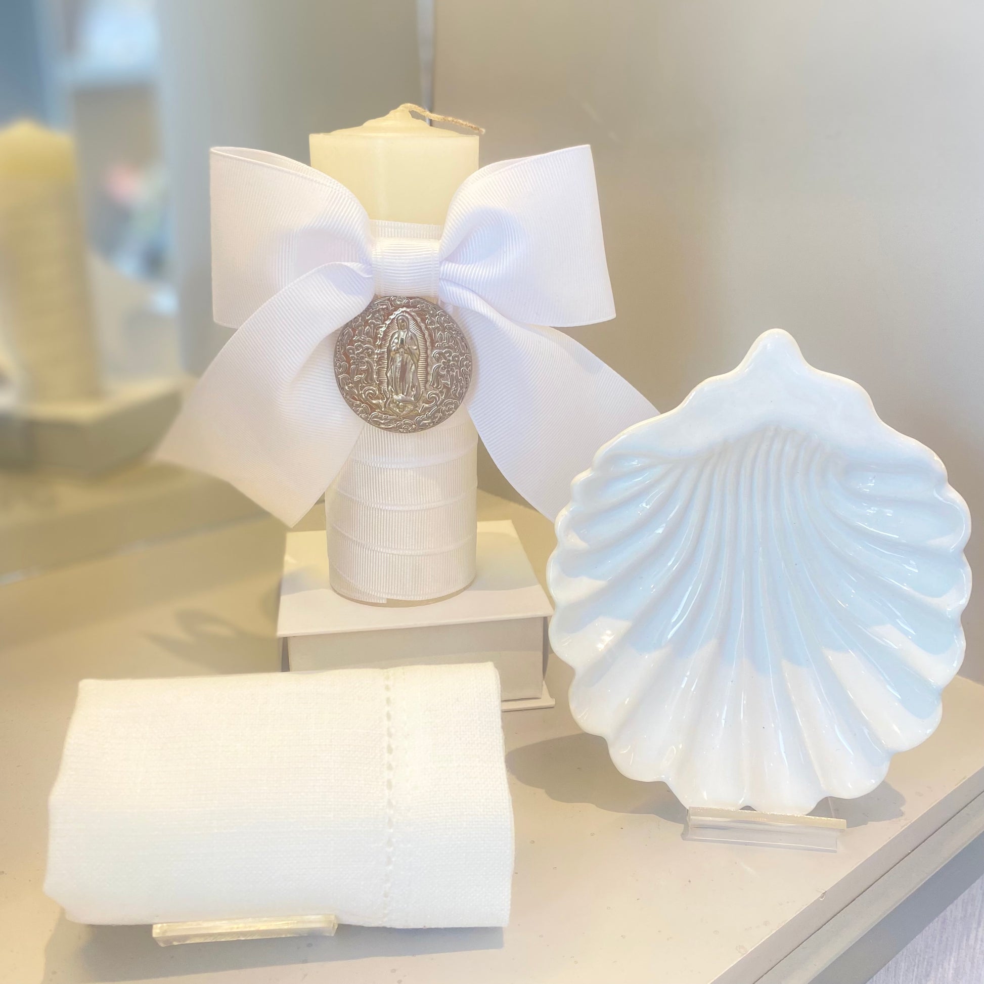 Hermosa vela con medallón de la Santísima Virgen de Guadalupe acompañada por la Conchita para el bautizo realizada a mano en cerámica blanca, con toallita de algodón.