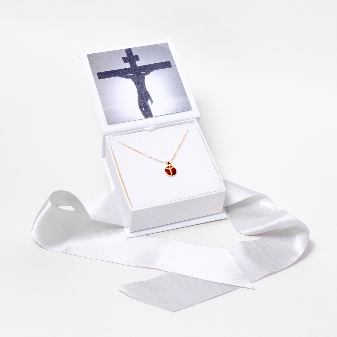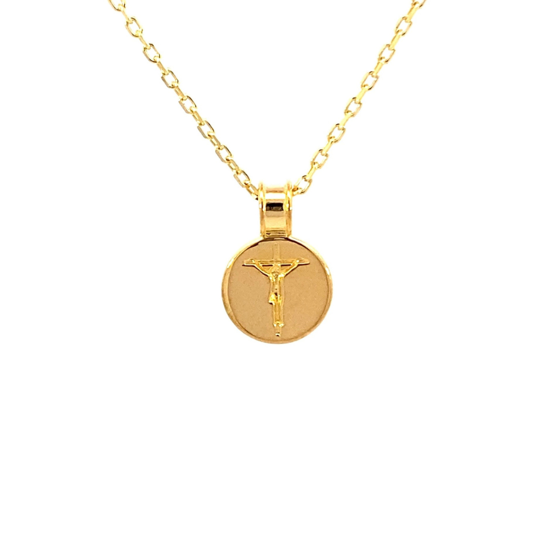 Esta elegante medalla presenta un crucifijo redondo con un acabado dorado o plateado, que aporta un toque de distinción y espiritualidad. El crucifijo, símbolo católico emblemático, tiene contornos suavemente curvados y detallados, destacando la figura de Jesucristo crucificado. El dorado resalta los detalles del diseño, creando un contraste visual que añade un toque de sofisticación.