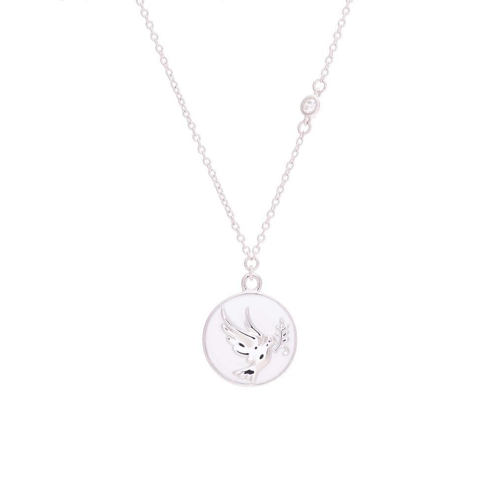 Realizada en plata fina .925 con baño de oro de 14 k (la dorada) y con baño de rodio (la plateada) con un fondo blanco de enamail que resalta de una manera muy especial la forma de paloma.